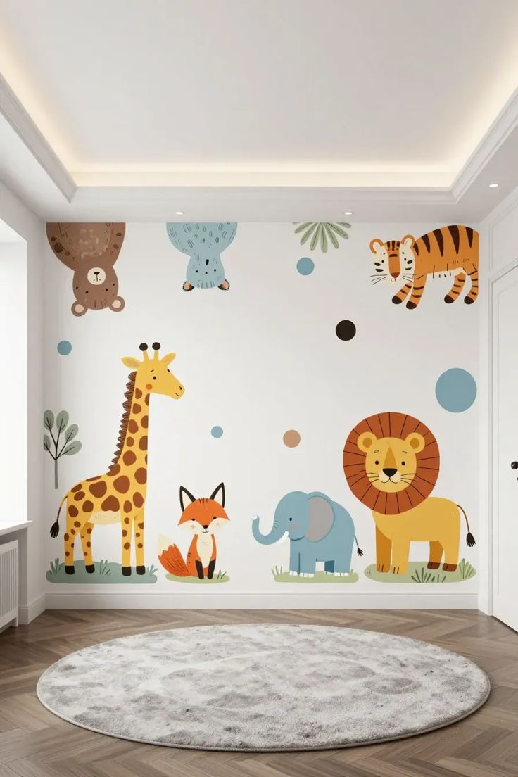 Cartoon themes, rainbow designs, jungle themes, and space themes are some of the most popular kids room wall designs.