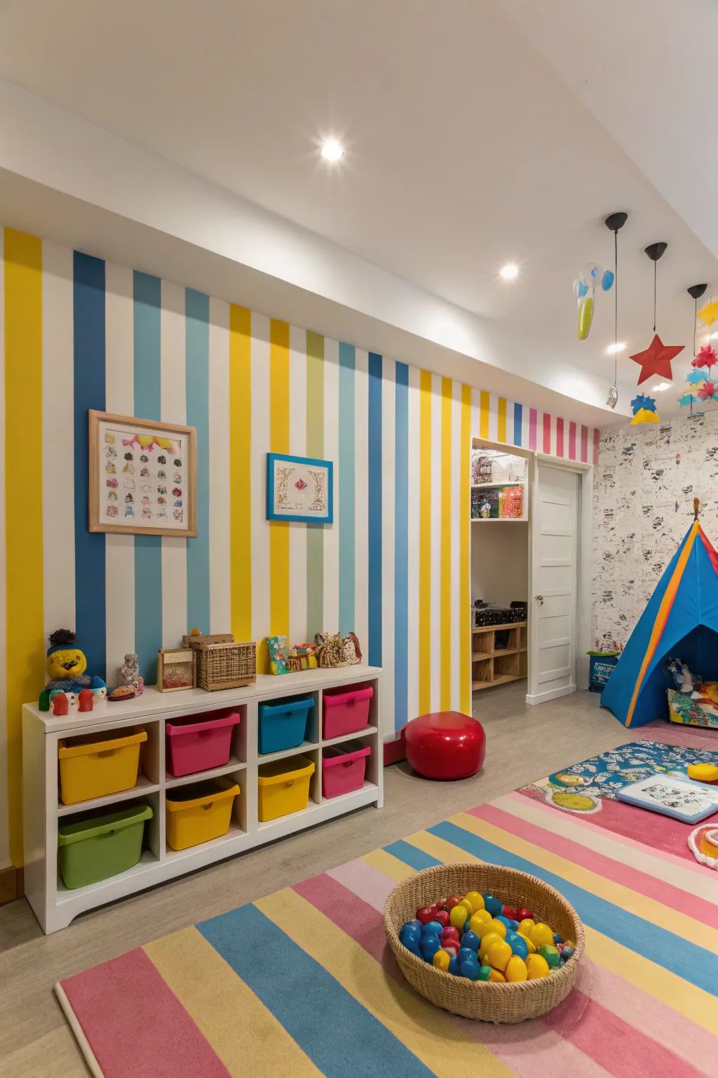 Soft and bright colors like blue, yellow, pink, green, and pastel shades are perfect for kids rooms.